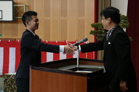 卒業生は、男子11名、女子16名、合計27名でした。3年1組担任の山﨑誠也教諭に続いて、3年2組担任の安達美穂教諭がそれぞれ卒業生を呼名し、卒業生が一人一人壇上に上がって校長から卒業証書を授与されました。その際、校長が全員と握手を交わし、「小さい学校」ならではの卒業証書授与となりました。