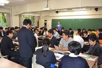 ワークショップの前には、大学生の皆さんの案内で、青山学院大学のキャンパス見学ツアーでした。渋谷区青山にある青山学院大学は、約30,000人が学ぶ大きな大学で、キャンパスもテレビドラマのロケ地としてもよく見る銀杏並木に代表される、大都市の真ん中にありながら緑豊かな落ち着いたたたずまいです。授業の合間の休憩時間とも重なり、吉高生は大学の雰囲気に多少なりとも触れることができたのではないでしょうか。
