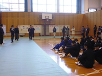 開会行事で、校長・生徒代表挨拶の後、発表・審査の形式について説明があり、実際に発表に移りました。今回の発表は、例年とは異なり、ポスター・プレゼンテーション形式で行いました。1~7班の生徒が、自分たちの作ったポスターの前で一人一人発表しました。発表を聞く人は、各班のポスターの前で発表を聞き、質疑応答などを行った後、次の発表ポスターの前に移動する形です。この形式では、ご来場いただいた地域の皆様から、それぞれの発表に対して活発な意見交換がなされました。生徒にとっては、内容的にも発表態度の面でも大変勉強になる時間でした。そして、聴取者の方からは、それぞれの班に対して付箋に意見を記入して貼り付けていただきました。