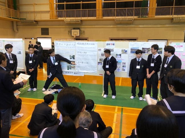司会は生徒が行い、2年生代表者の野城琢人くんの挨拶を受けて、ポスター自由閲覧の後、ポスターセッションがスタートしました。各チームが発表を行い、その後質疑応答の時間や交流タイムが設けられ、生徒と来場者の間で意見や感想などを双方交えることで、より内容の濃いものとなりました。