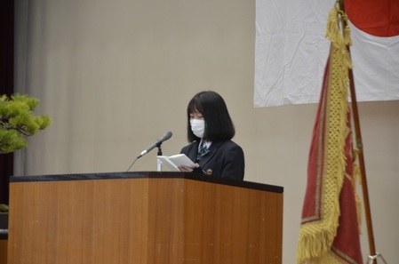 校長式辞では、学校長が「これからの未知の時代を逞しく生きていって欲しい」と激励の言葉を述べ、在校生送辞では岡村ひなたさん(生徒会副会長)が卒業生との思い出の詰まった贈る言葉を述べました。