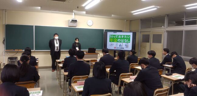 3時間目は、浜田年金事務所より2名の方に来校いただき、二十歳になったら年金を納める義務が生じること、収入の無い学生時代には、学生納付特例制度の手続きをすることで保険料の納付が猶予される制度があることを教えていただきました。また、年金は老齢年金だけでなく、障がいを負ったり、一家の働き手が亡くなったりしたときに支える社会保障制度の一つであることを学びました。