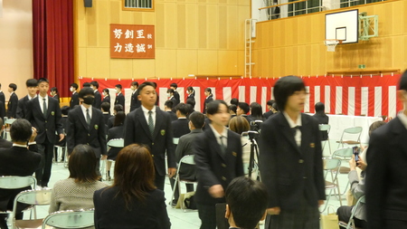 入学式に続いて、新入生と在校生との対面式をおこないました。生徒会長 鈴木健太さんから新入生に向けて歓迎の言葉を述べ、新入生代表で江谷羽絆さんが挨拶をして全校生徒が対面をしました。
