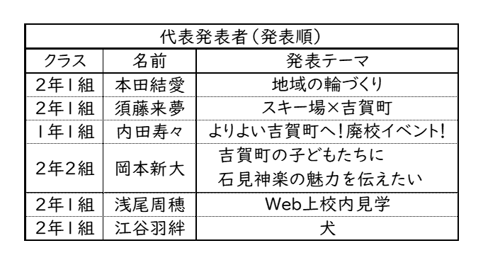午前は学校で1、2年生全員がそれぞれが取り組んできた活動を発表してくれました。その中で代表6人が選出され、午後は柿木ふれあい会館で代表者発表を行いました。